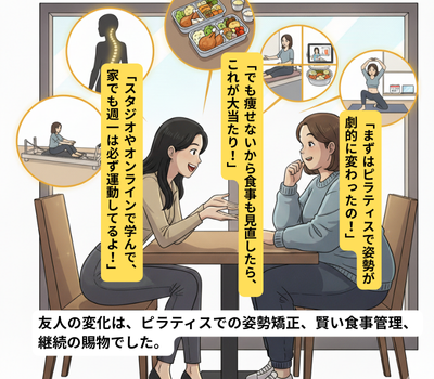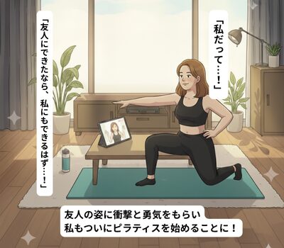 このブログは、運動嫌いで中年太りだった私が、友人(の激変!)に影響されてピラティスを始め、理想の体を手に入れるまでの「リアルな体験談」と「40代からでも遅くない具体的な方法」をお届けするブログです。まずは、あなたの今一番のお悩みから探してみてください。